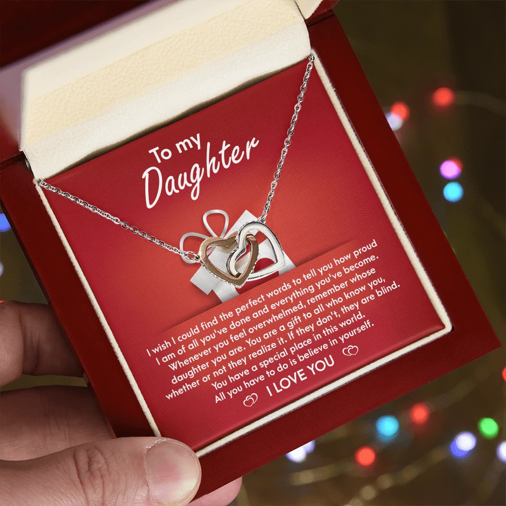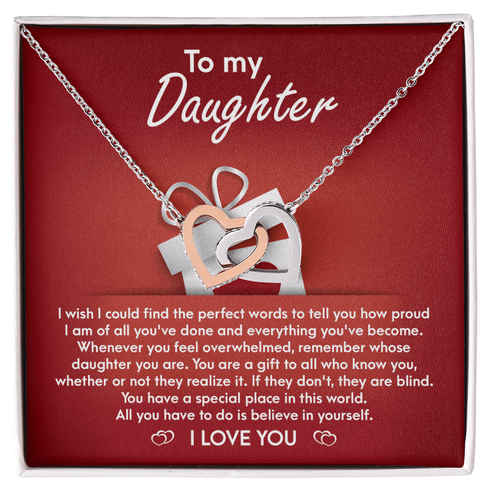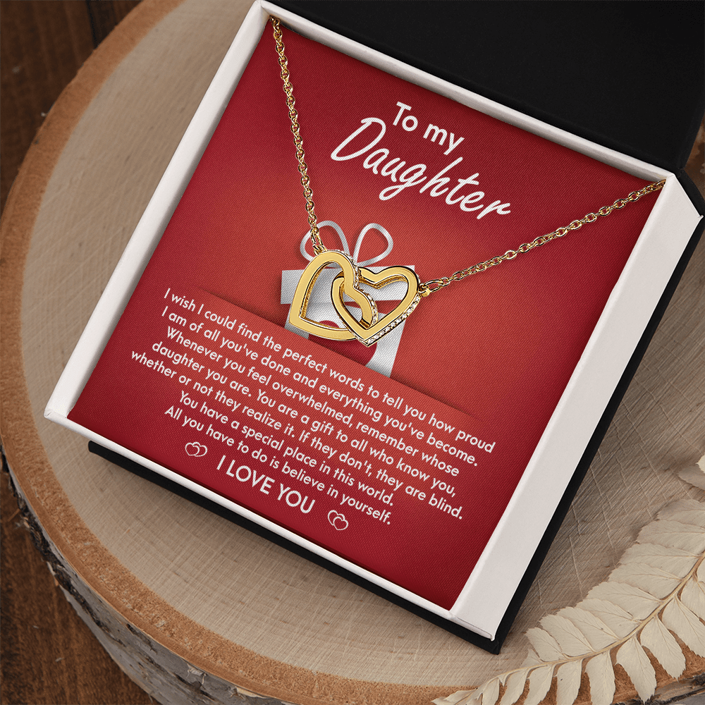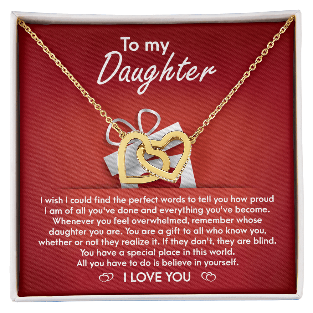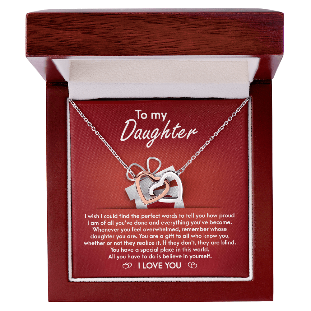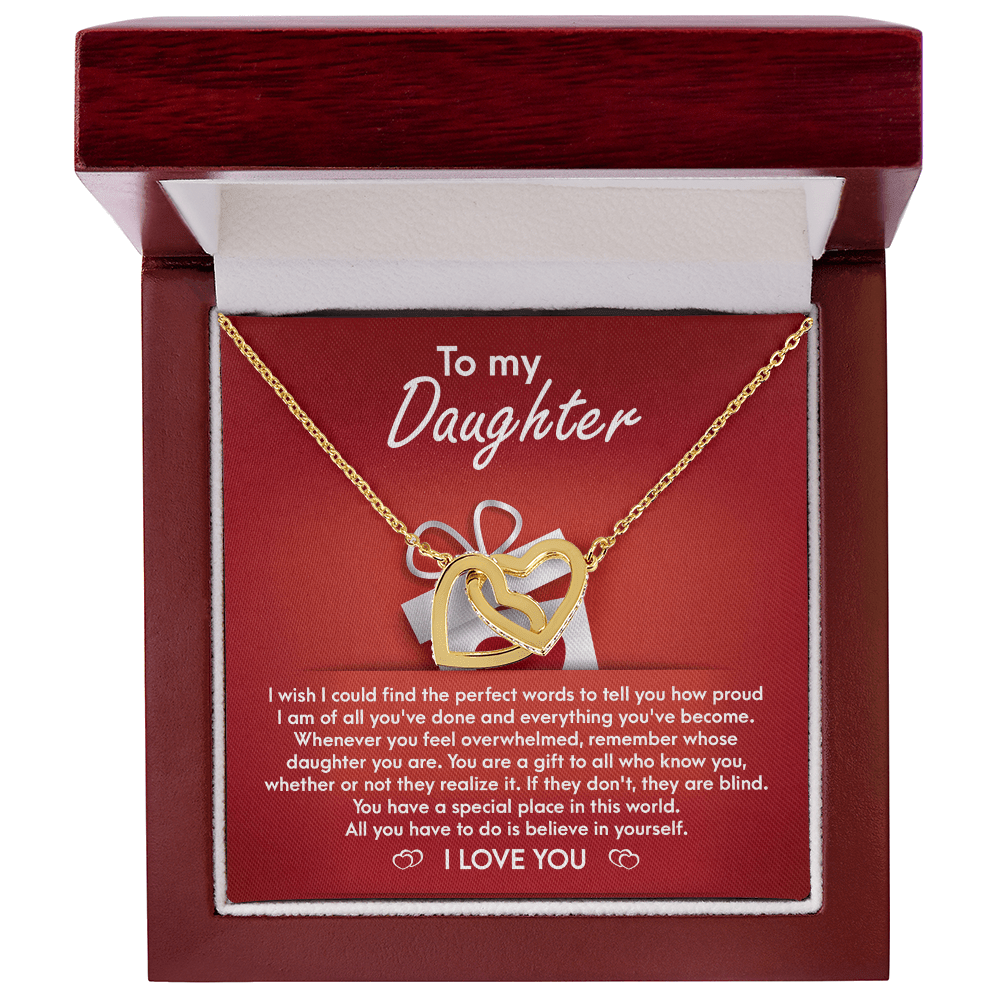 I wish I could find the perfect words to tell you how proud I am of all you've done and everything you've become . Whenever you feel overwhelmed , remember whose daughter you are . You are a gift to all who knowyou , whether or not they realize it .If they don't ,they are blind. You have a special place in this world. All you have to do is believe in yourself.