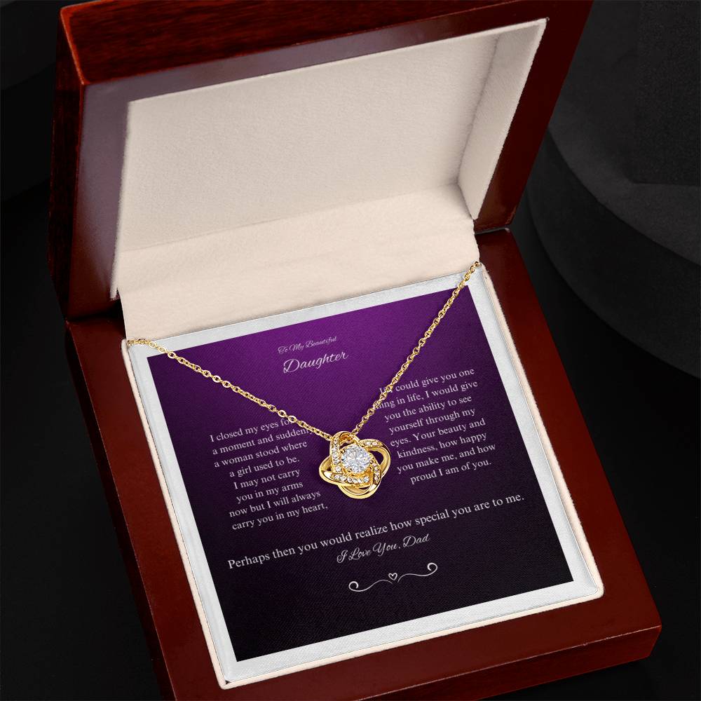 I closed my eyes for a moment and suddenly a woman stood where a girl used to be. I may not carry you in my arms now but I will always carry you in my heart. If I could give you one thing in life, I would give you the ability to use yourself through my eyes. Your beauty and kindness, how happy you make me, and how proud I am of you. Perhaps then you would realize how special you are to me. I love you, Dad.